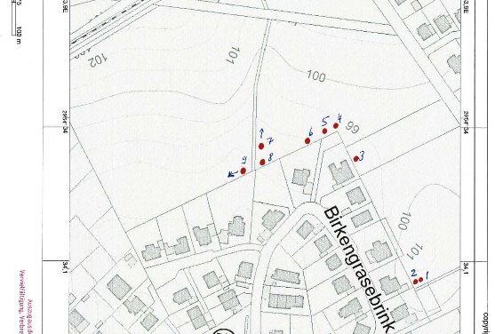 In der Karte auf Seite 4 ist unschwer zu erkennen, dass zwischen den Grundstücken Birkengrasebrink 30 bis 34 fast zwei Meter Höhenunterschied liegen.